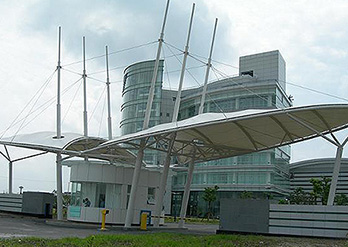 出入口膜結構打破了純直線建筑風格的模式,以其獨有的優美曲面造型,簡潔、明快、剛與柔、力與美的完美組合,呈現給人以耳目一新的感覺,同時給建筑設計師提供了更大的想象和創造空間