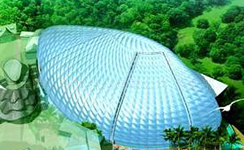 膜結構是由多種高強薄膜材料(PVC或Teflon)及加強構件(鋼架、鋼柱或鋼索)通過一定方式使其內部產生一定的預張應力以形成某種空間形狀,作為覆蓋結構,并能承受一定的外荷載作用的一種空間結構形式。膜結構可分為充氣膜結構和張拉膜結構兩大類。充氣膜結構是靠室內不斷充氣,使室內外產生一定壓力差(一般在10㎜~30㎜水柱之間),室內外的壓力差使屋蓋膜布受到一定的向上的浮力,從而實現較大的跨度。張拉膜結構則通過柱及鋼架支承或鋼索張拉成型。
